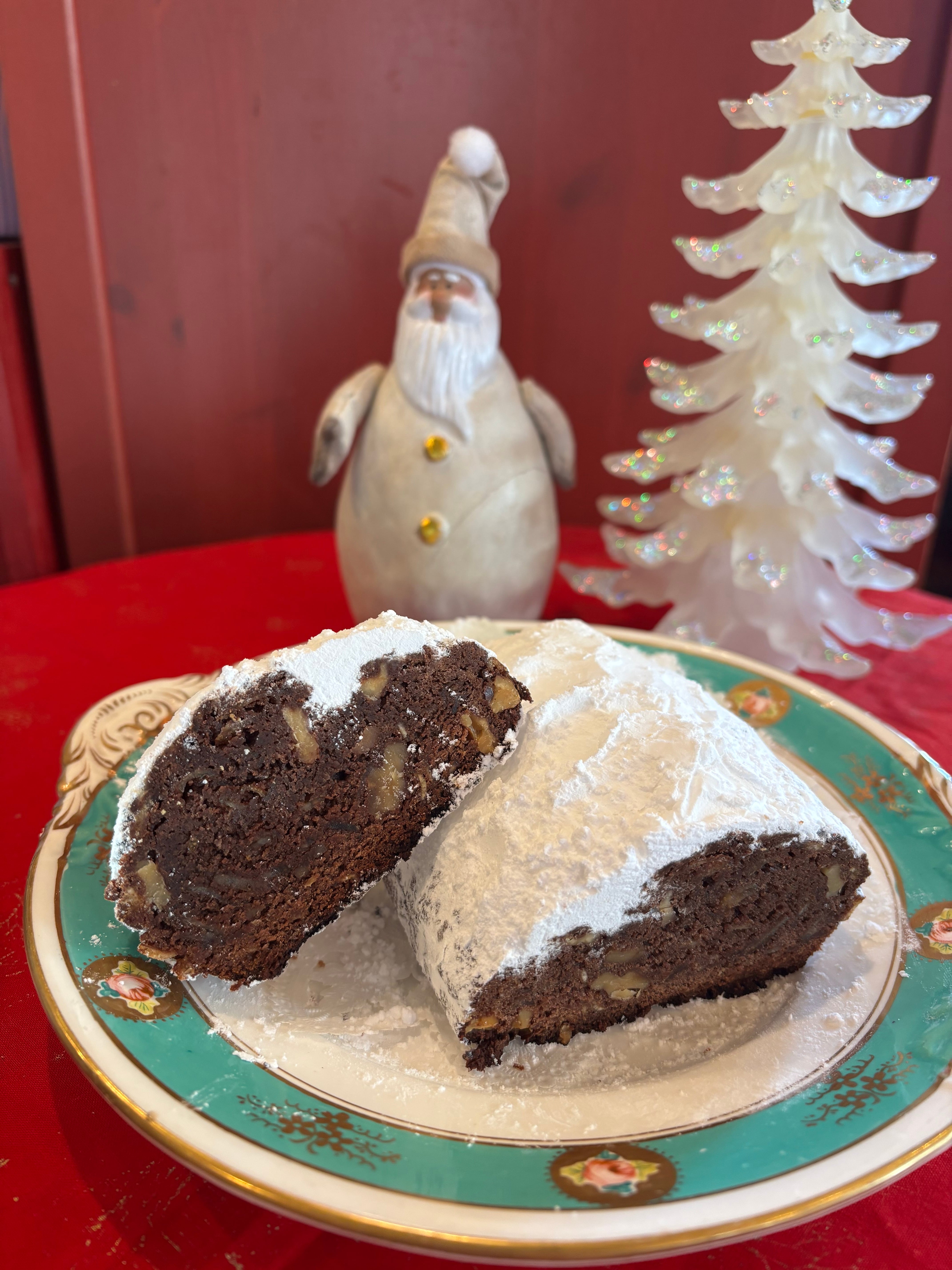 ココアの生地にたっぷりとナッツやオレンジピールは入っています。クリスマスまでの期間に少しずつスライスして召し上がっていただくことで、フルーツやラム酒の風味が生地に移り、味が変化していくのをお楽しみにいただけます。乾燥を防ぐためにカットした断面はラップで包んでいただき冷蔵庫などの涼しいところで保存をお願いいたします。